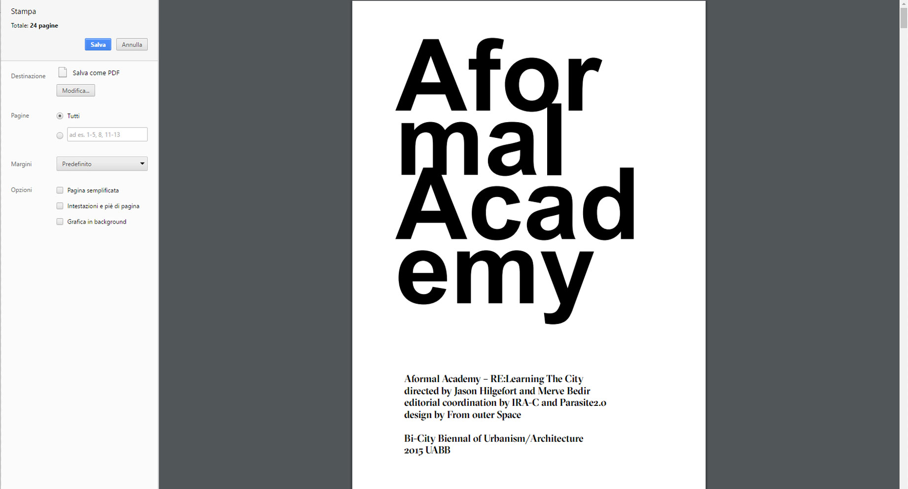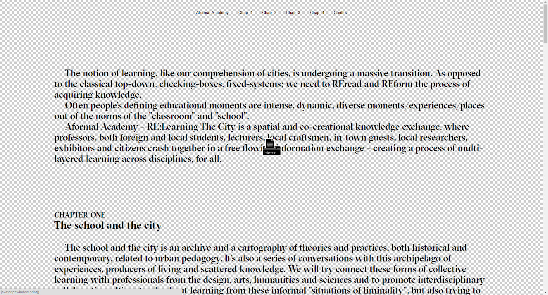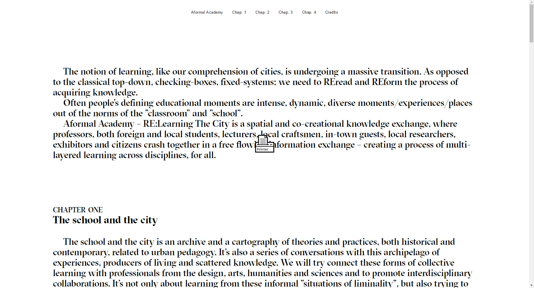 Aformal Academy–RE: Learning The City is a spatial and co-creational knowledge exchange, where professors, both foreign and local students, lecturers, local craftsmen, in-town guests, local researchers, exhibitors and citizens crash together in a free-flowing information exchange–creating a process of multi-layered learning across disciplines, for all.