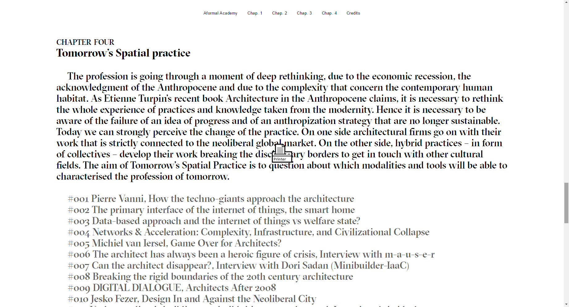 The profession is going through a moment of deep rethinking, due to the economic recession, the acknowledgment of the Anthropocene and the complexity that concerns the contemporary human habitat. As Etienne Turpin’s recent book Architecture in the Anthropocene claims, it is necessary to rethink the whole experience of practices and knowledge taken from modernity. Hence it is necessary to be aware of the failure of an idea of progress and of an anthropization strategy that is no longer sustainable. Today we can strongly perceive the change of the practice. On one side architectural firms go on with their work that is strictly connected to the neoliberal global market. On the other side, hybrid practices–in form of collectives – develop their work breaking the disciplinary borders to get in touch with other cultural fields. The aim of Tomorrow’s Spatial Practice is to question which modalities and tools will be able to characterize the profession of tomorrow.