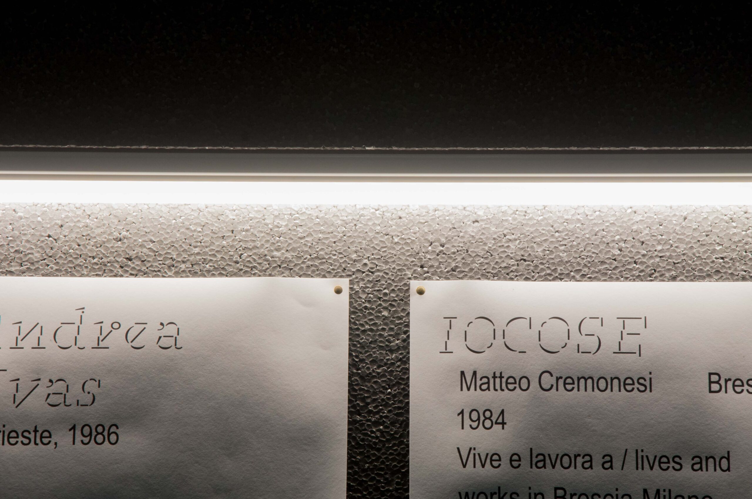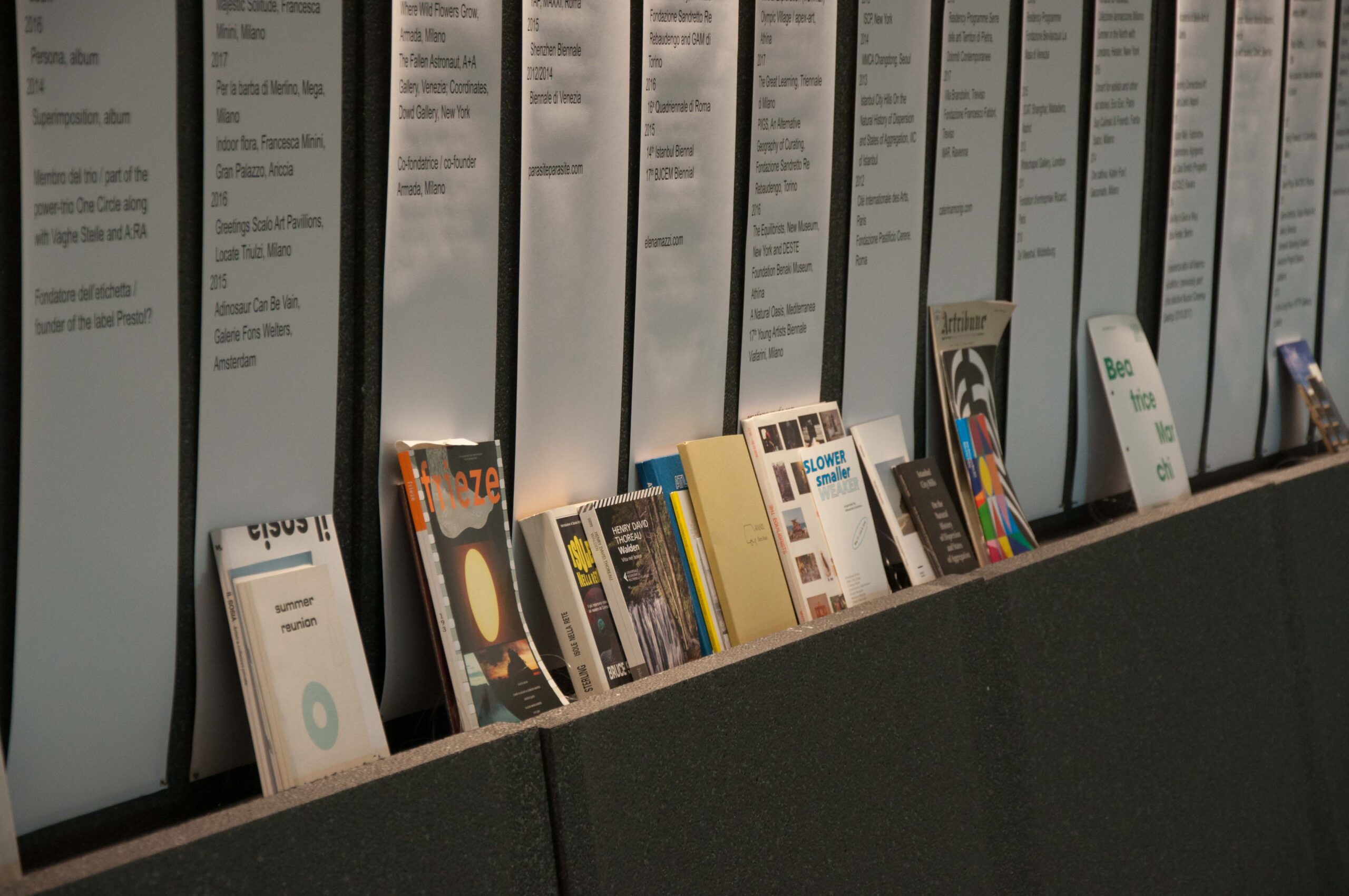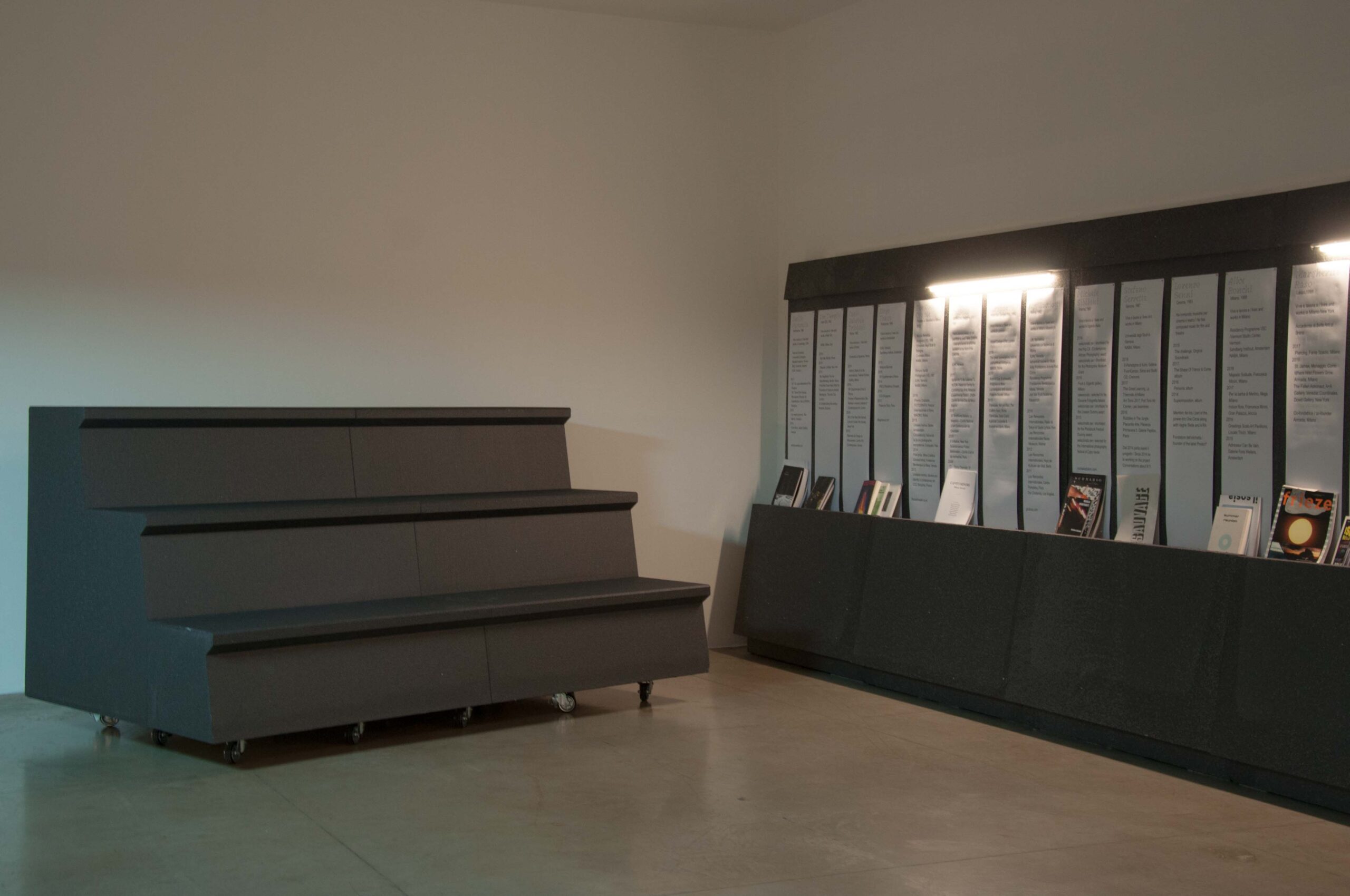 It is an artwork between installation and exhibition design, that aims to reflect on one hand on the modalities through which we receive what is exhibited within the museum, and on the other hand on the different levels of interaction that is possible to build among the contents themselves. The project is composed of two elements: a pair of mobile bleachers and fourteen wall exhibitors – seven for each short wall. Thanks to the mobile elements, it is possible to change continuously the configuration of the space in which the visitors consult the biographies and the bibliographies placed on the wall exhibitors. The dark tones of the material used for bleachers and exhibitors are in contrast with the pale tones of the floor and walls of the space, thus improving their visual impact inside the museum. The lighting system – three neon led integrated into the upper part of the exhibitors on each short wall – is designed in order to define better the area of the biographies and bibliographies. The second source of light comes from Ruth Bera’s artwork placed in the middle of the room. “Audience infrastructure” is a tool of observation, a device to allow the visitor to go deep into the different personalities and references of the artists.