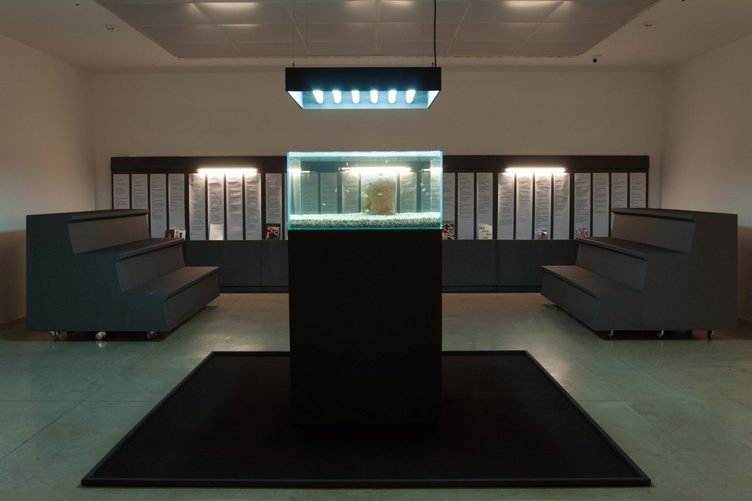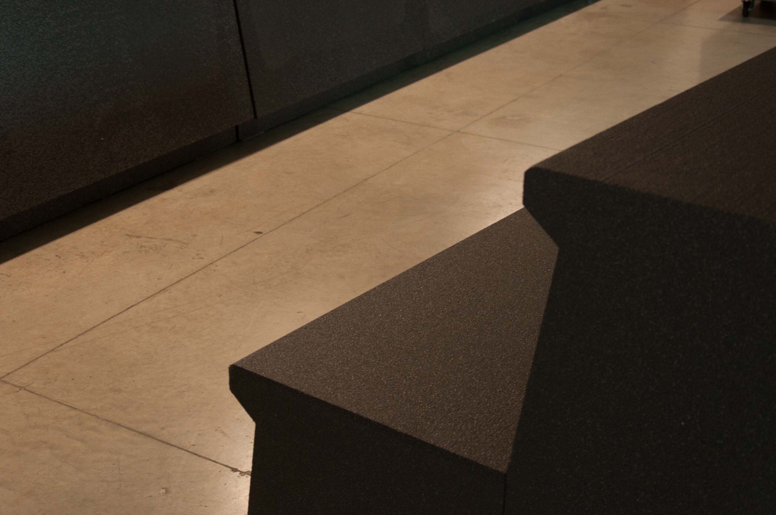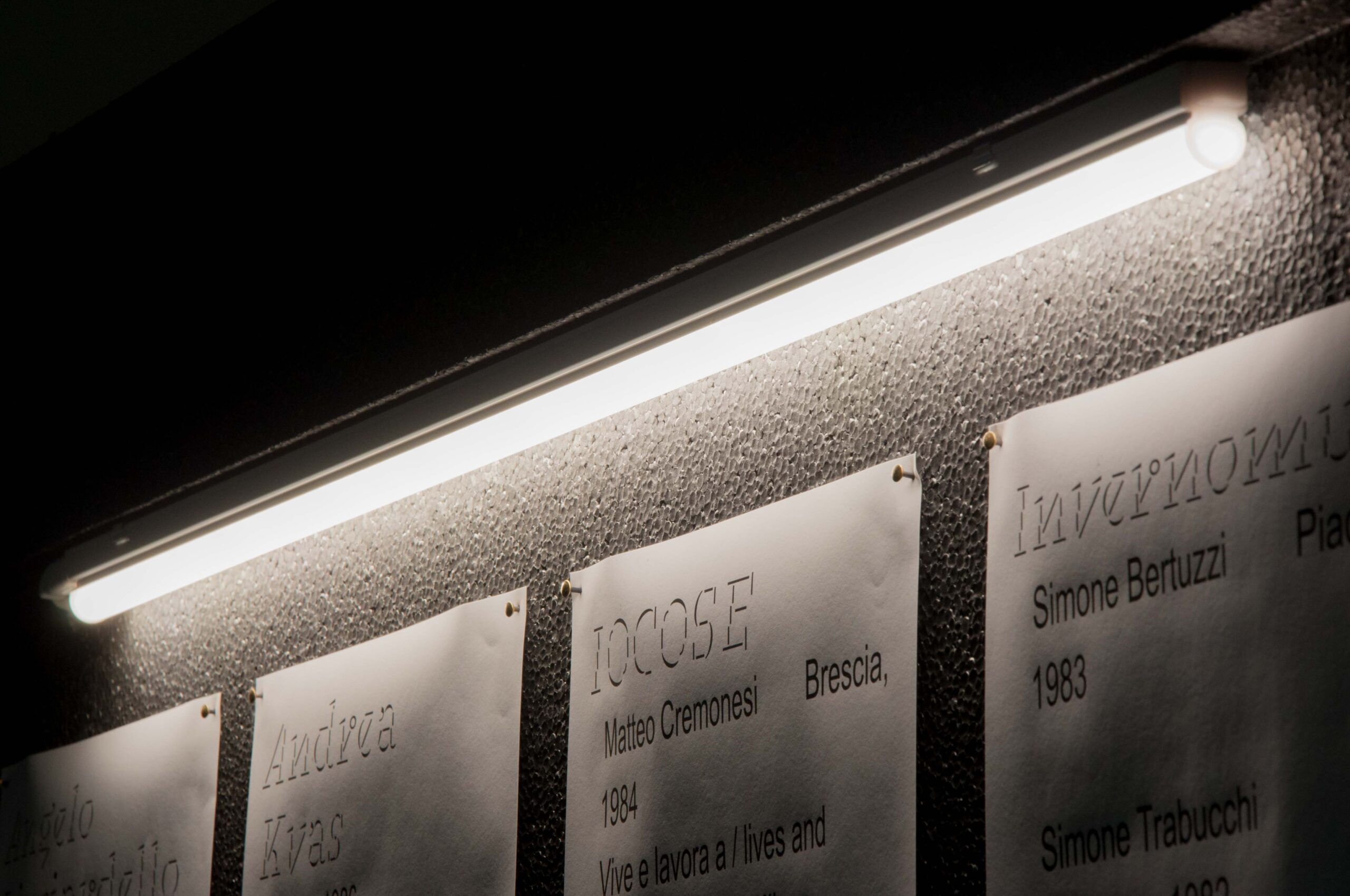 It is an artwork between installation and exhibition design, that aims to reflect on one hand on the modalities through which we receive what is exhibited within the museum, and on the other hand on the different levels of interaction that is possible to build among the contents themselves. The project is composed of two elements: a pair of mobile bleachers and fourteen wall exhibitors – seven for each short wall. Thanks to the mobile elements, it is possible to change continuously the configuration of the space in which the visitors consult the biographies and the bibliographies placed on the wall exhibitors. The dark tones of the material used for bleachers and exhibitors are in contrast with the pale tones of the floor and walls of the space, thus improving their visual impact inside the museum. The lighting system – three neon led integrated into the upper part of the exhibitors on each short wall – is designed in order to define better the area of the biographies and bibliographies. The second source of light comes from Ruth Bera’s artwork placed in the middle of the room. “Audience infrastructure” is a tool of observation, a device to allow the visitor to go deep into the different personalities and references of the artists.