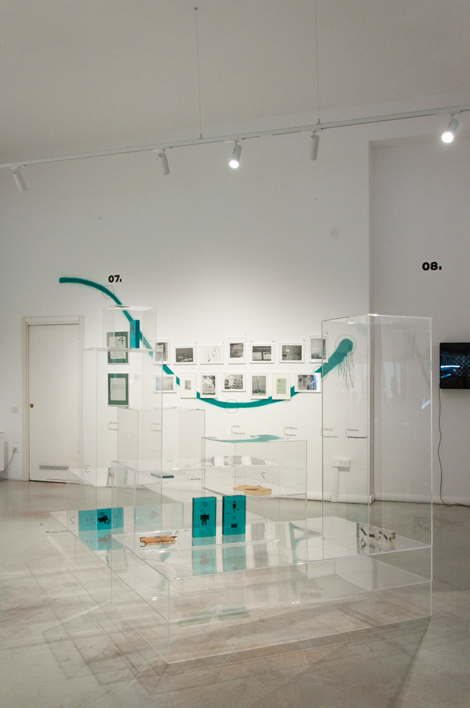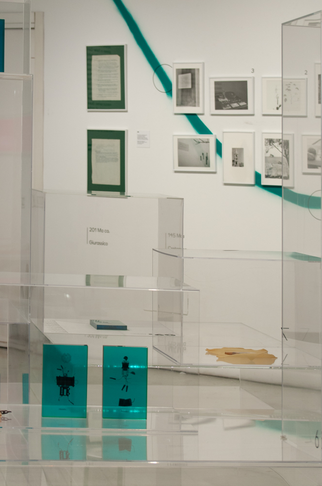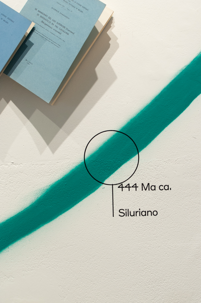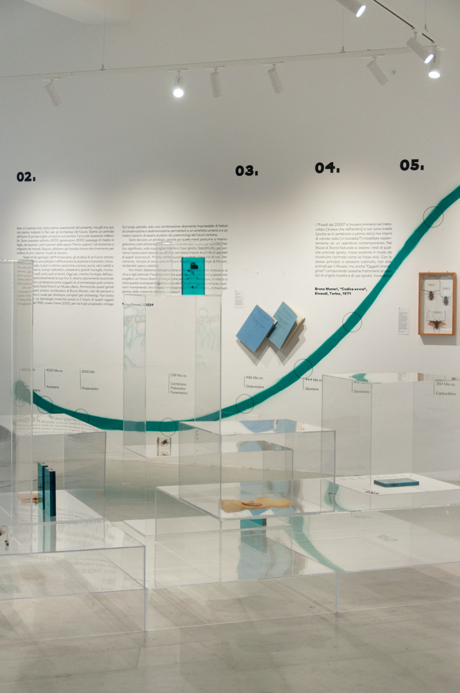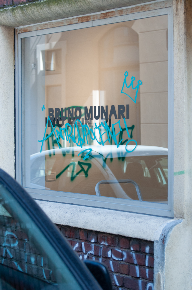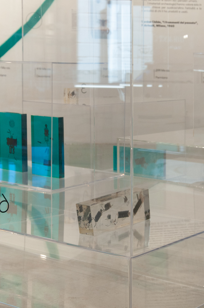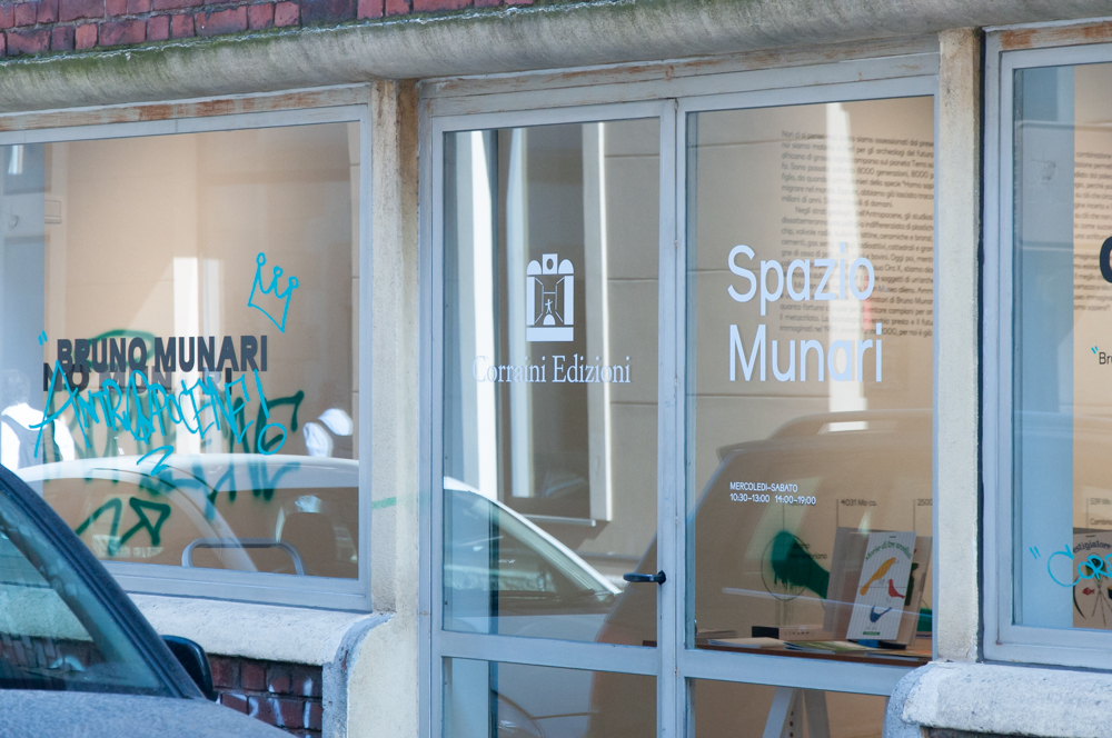 Inspired by the transparencies and overlapping of colours and surfaces of the original Fossils of 2000, the exhibition design borrows existing vitrines from ADI Design Museum, creating a volumetric composition. Transparent glass vitrines help create an endless game of juxtapositions between the different Munari pieces. On the other hand, on the two long walls and the windows of Spazio Munari, a series of graphic contents are vandalized with graffiti tags.