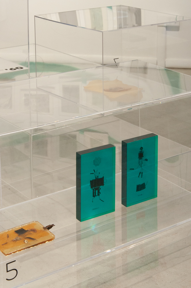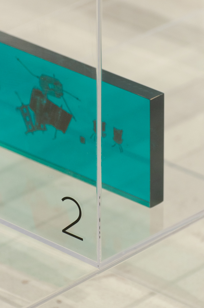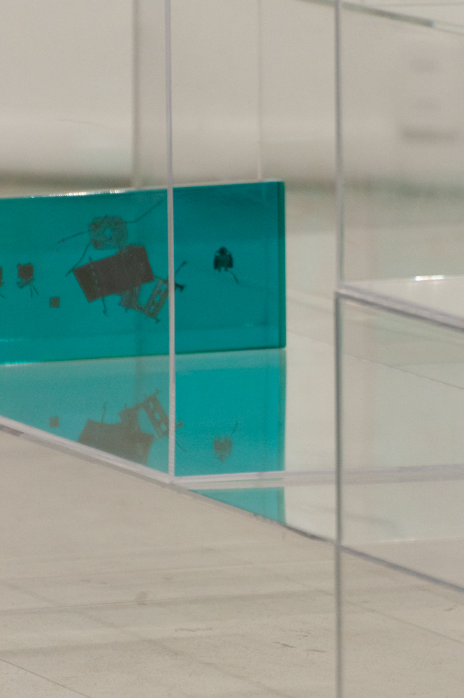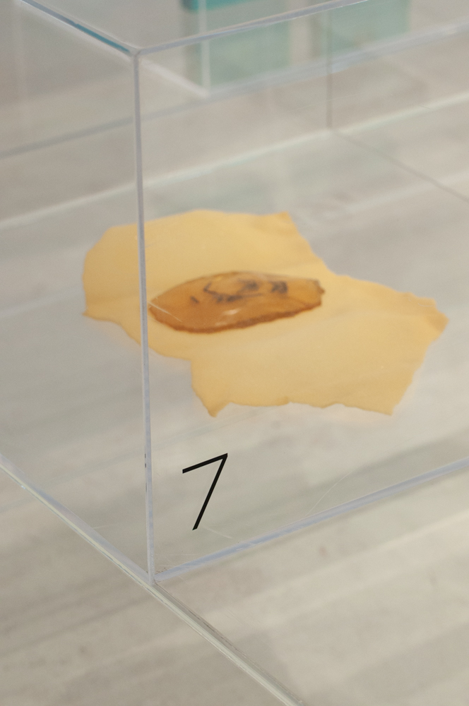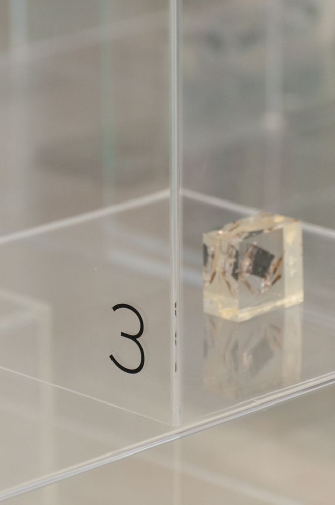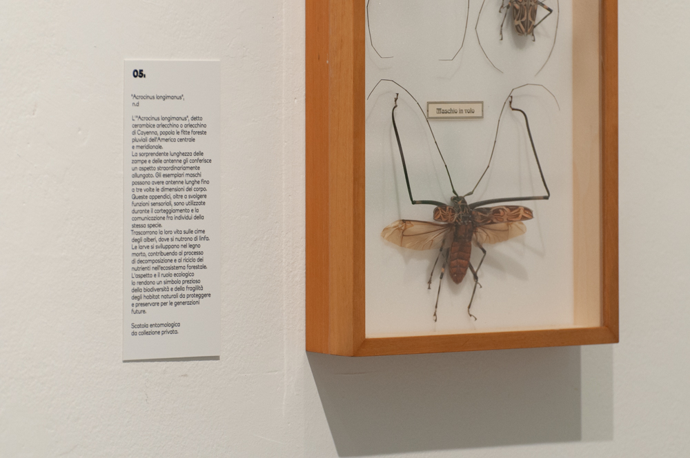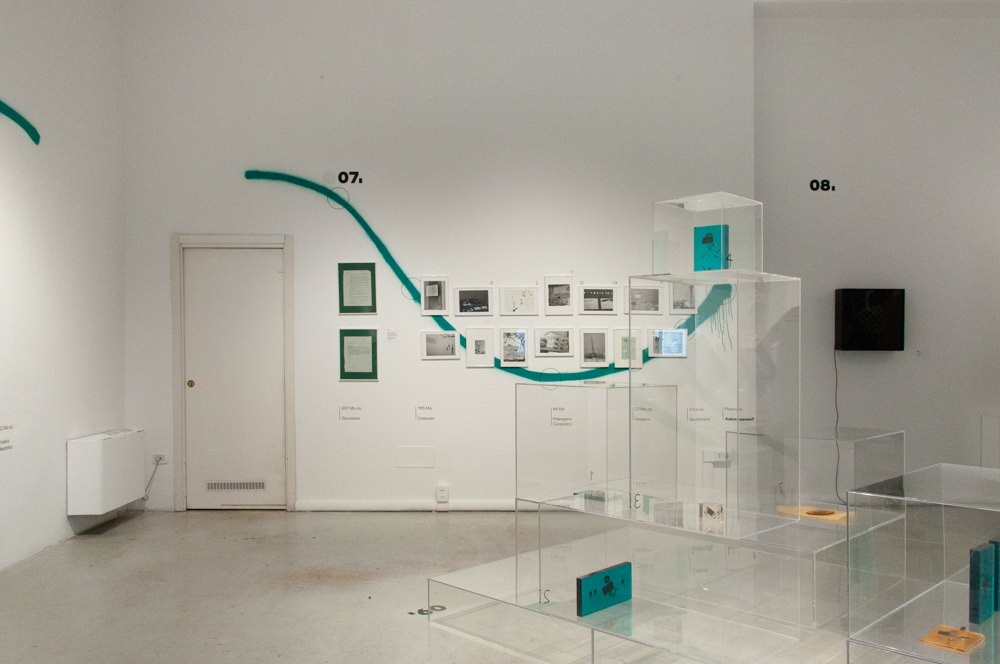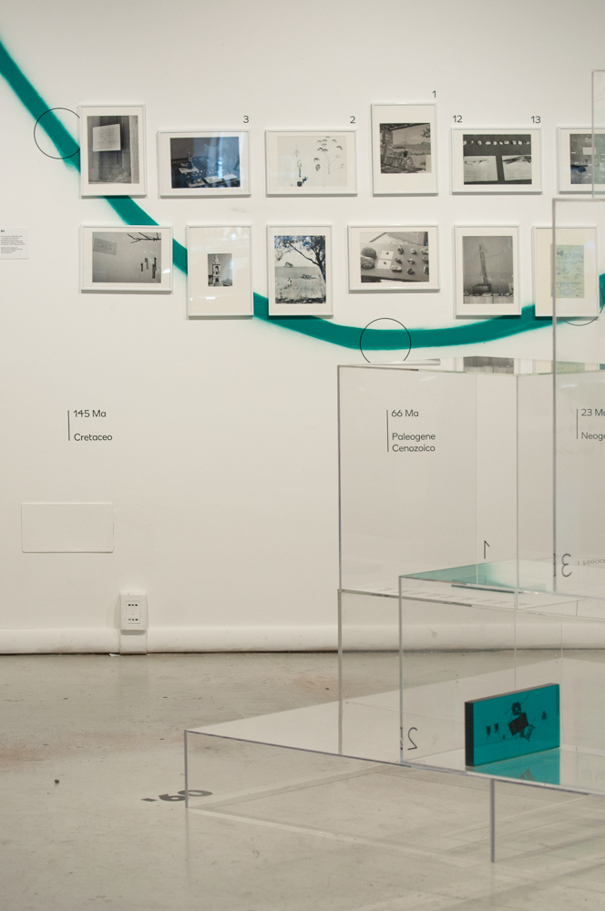 Inspired by the transparencies and overlapping of colours and surfaces of the original Fossils of 2000, the exhibition design borrows existing vitrines from ADI Design Museum, creating a volumetric composition. Transparent glass vitrines help create an endless game of juxtapositions between the different Munari pieces. On the other hand, on the two long walls and the windows of Spazio Munari, a series of graphic contents are vandalized with graffiti tags.
