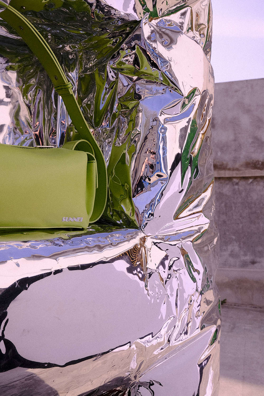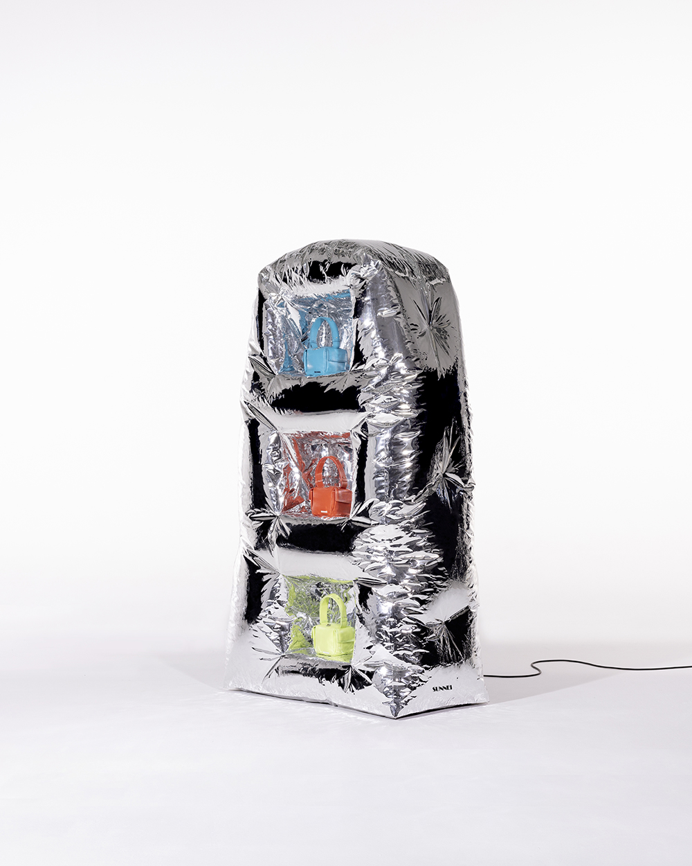 Lapietra is a special installation created for and developed with the fashion brand SUNNEI. The inflatable fixture is an itinerant structure thought and manufactured with the aim to create a full-on experience from start to end. The mirrored PVC prop features monolithic edges and small recesses caved to fit SUNNEI’s latest it-bags: Labauletto and Lacubetto. The self-standing system, engineered to simplify the installation process as much as possible, is triggered by plugging the structure to the wall. Once powered, the fixture inflates on its own without the need for human help. Light and packable, Lapietra puts a spin on circularity going on an international retail tour.