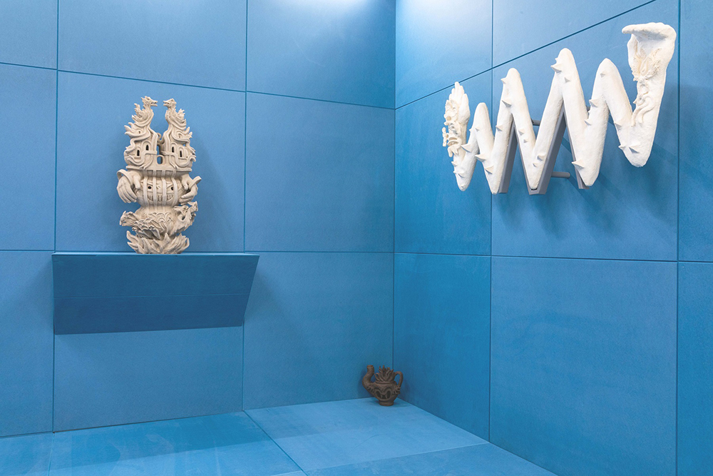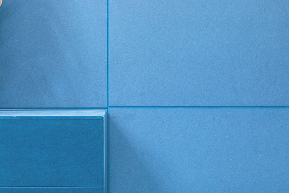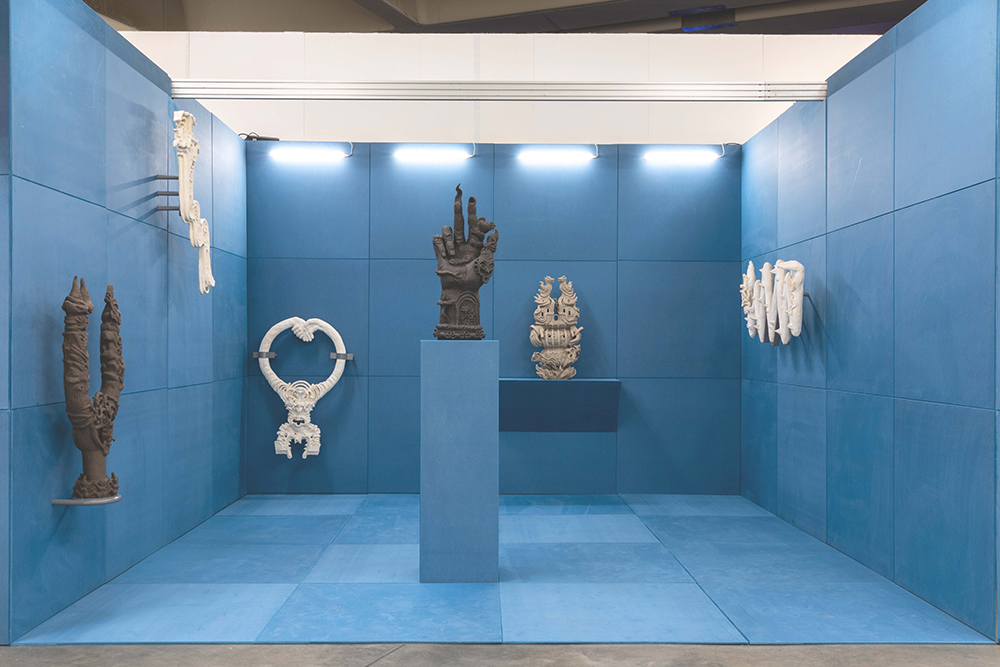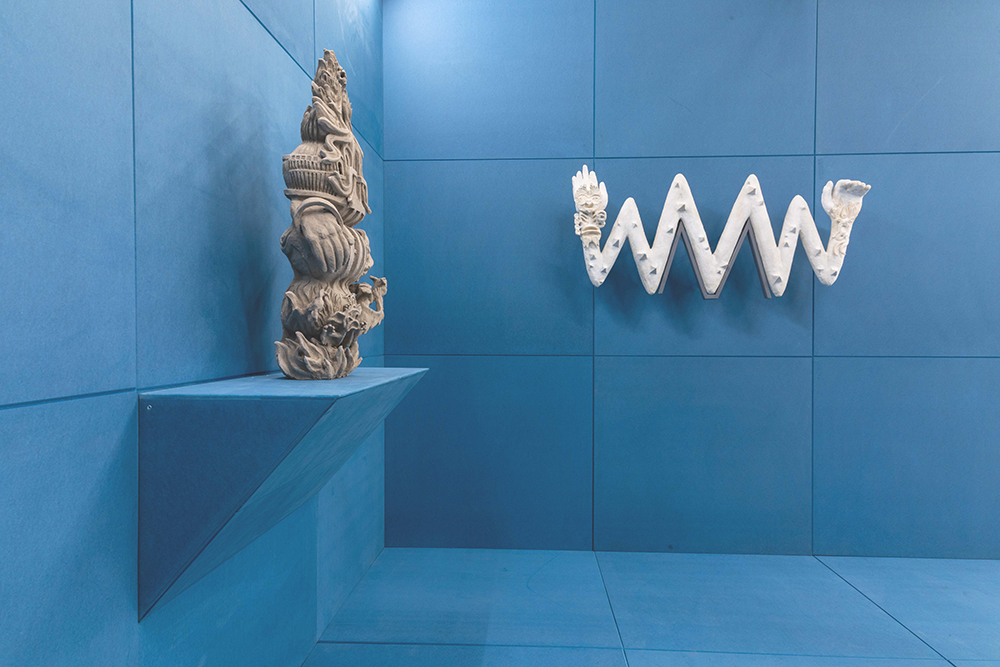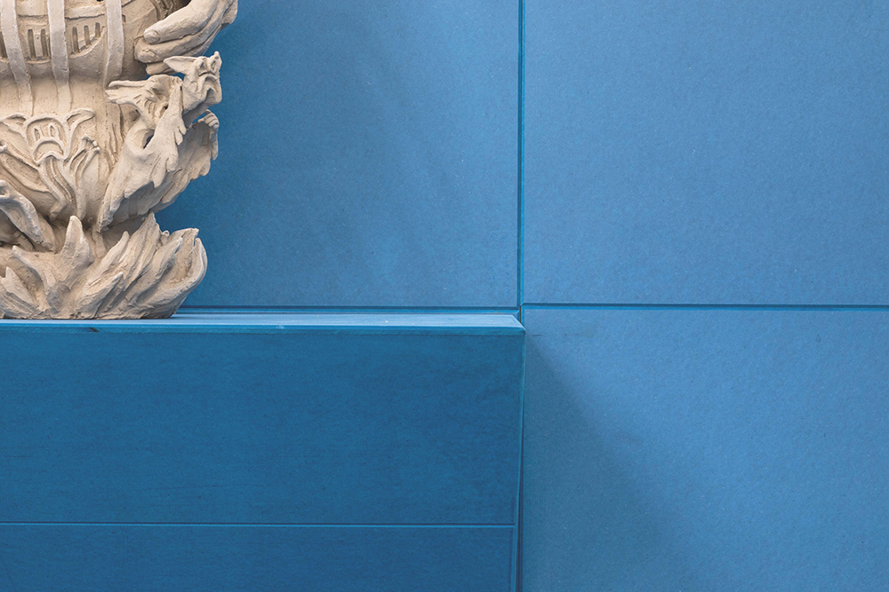 The project is the display for a booth of Damien and the Love Guru in Miart fair in Milan. It consists in a series of simple tiles made with mdf wood. The choice of the mdf wood, a fire-proof material, comes from a reflection on safety norms regarding the realization of spaces dedicated to contemporary art. The decision to show it is an attempt to exhibit in a simple way the technical reality of this kind of spaces, most of the time covered or hidden. A series of tiles created different volumes/elements to exhibit works. Following the relationship with the artist and her works, we wanted to build an environment that reinterprets the traditional layout of archeology museums. A homogeneous but strongly characterized background able to emphasize the works, thus differentiating itself from the traditional white cube that characterizes the fair booth.