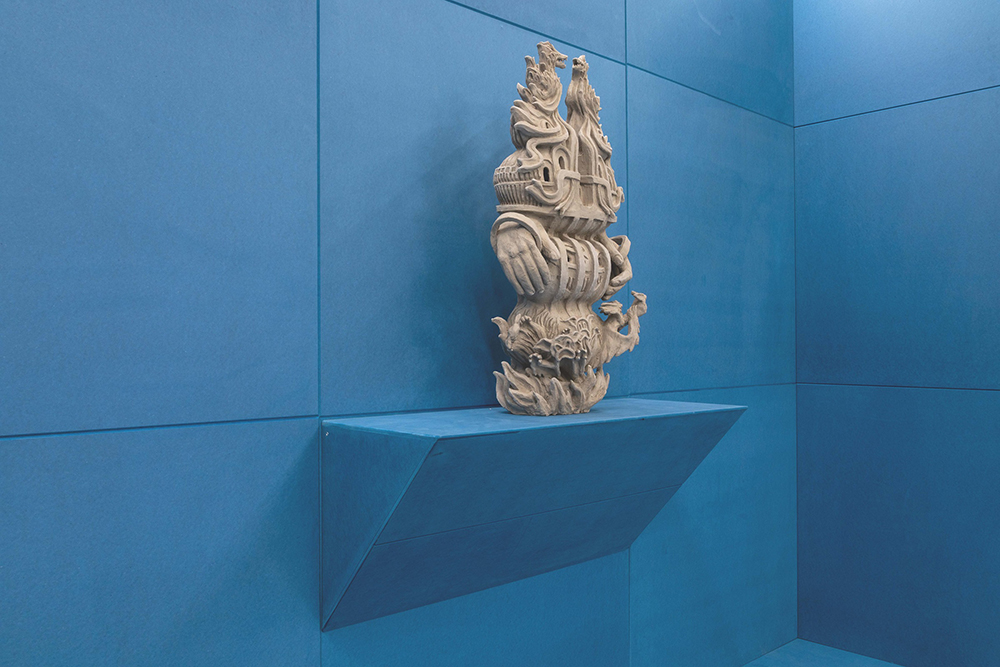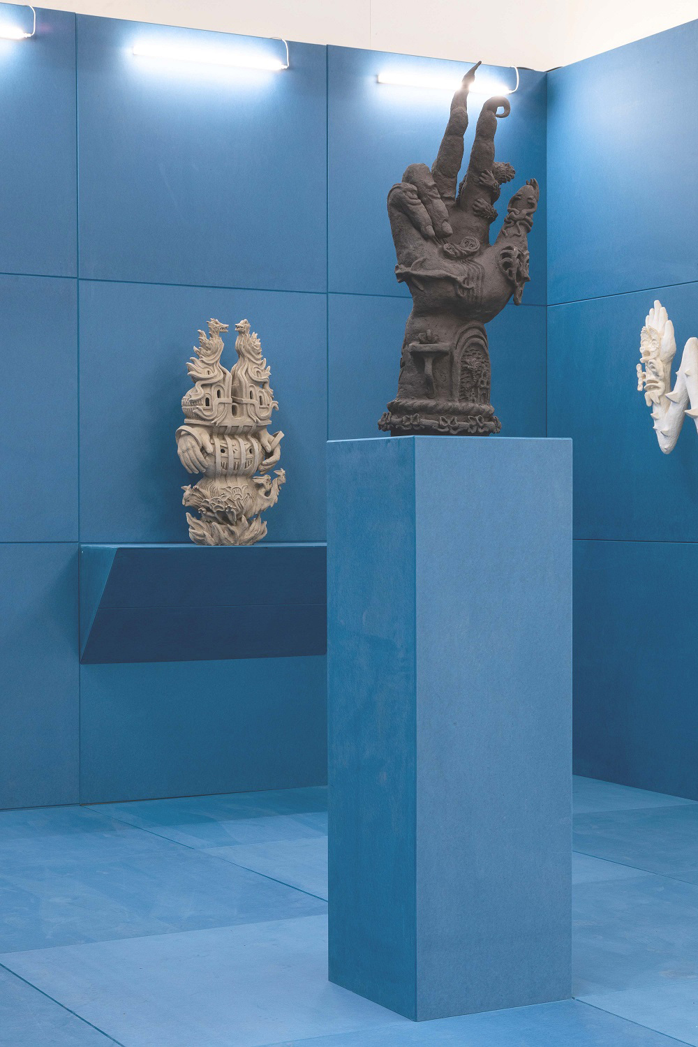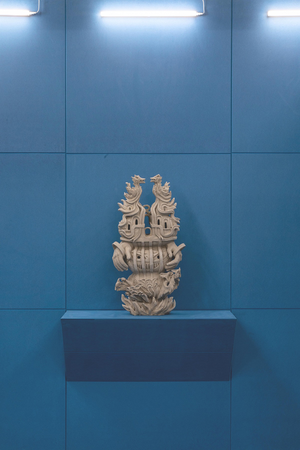 The project is the display for a booth of Damien and the Love Guru in Miart fair in Milan. It consists in a series of simple tiles made with mdf wood. The choice of the mdf wood, a fire-proof material, comes from a reflection on safety norms regarding the realization of spaces dedicated to contemporary art. The decision to show it is an attempt to exhibit in a simple way the technical reality of this kind of spaces, most of the time covered or hidden. A series of tiles created different volumes/elements to exhibit works. Following the relationship with the artist and her works, we wanted to build an environment that reinterprets the traditional layout of archeology museums. A homogeneous but strongly characterized background able to emphasize the works, thus differentiating itself from the traditional white cube that characterizes the fair booth.