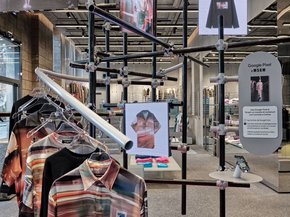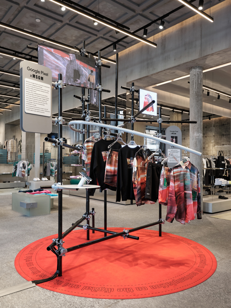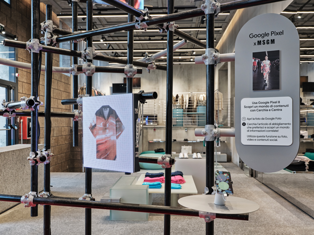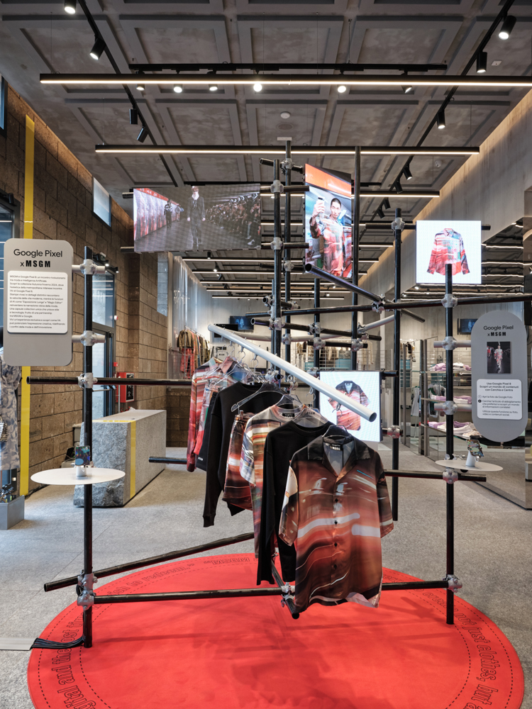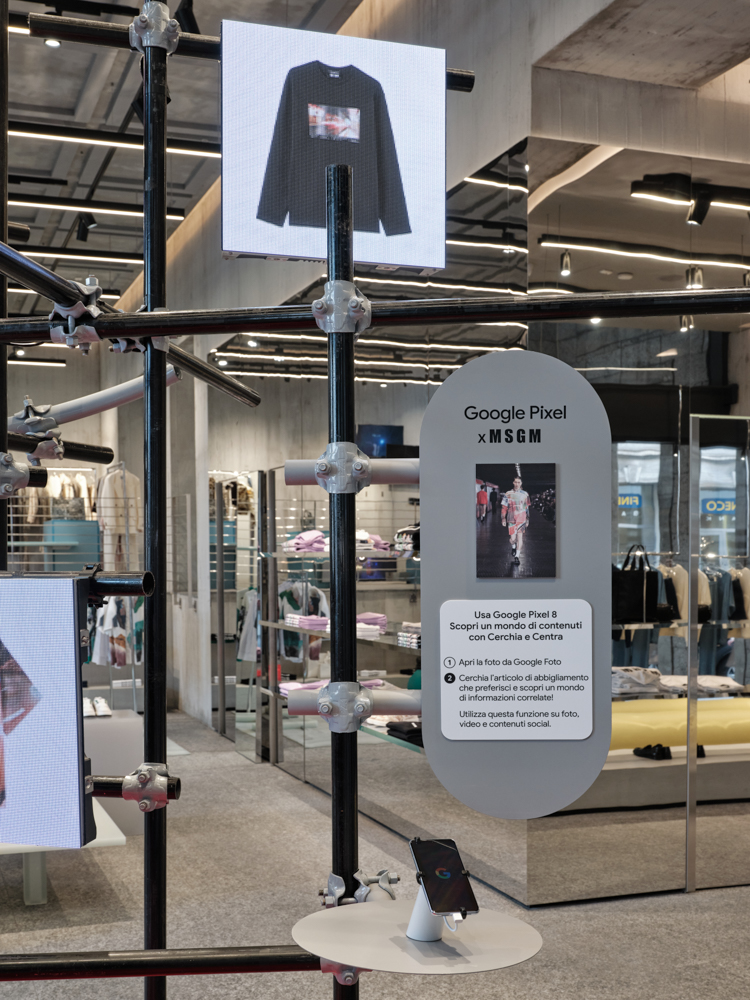 Inspired by antennas, from insects to the telephone network’s cell towers, the installation presented the latest collaboration between MSGM and Google Pixels. The installation is the hardware, where the new collection by MSGM, the Google Pixels devices and audio-visual contents are mixed and looped in a circular flow.