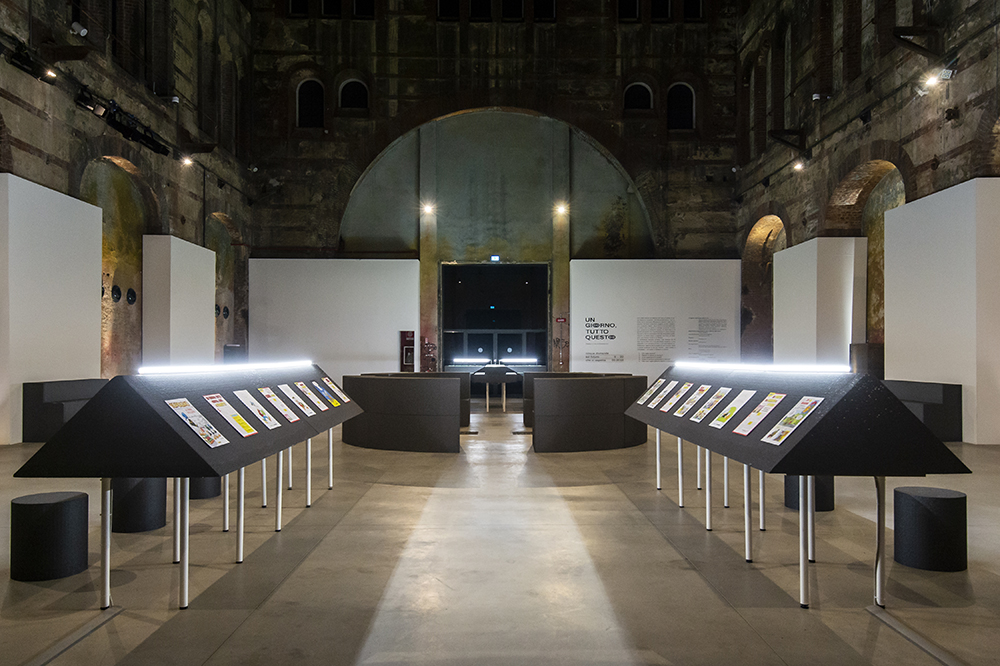The display designed for the exhibition “Un giorno tutto questo…5 domande sul futuro che ci aspetta” in occasion of the Salone Internazionale del libro di Torino occupies the spaces of the Duomo at OGR (Officine Grandi Riparazioni), and it grows in length for the entire room. Starting from the plan of the room, the projects divide it into 3 corridors, three autonomous areas that remind typical shapes and directions in architecture. All the elements are made of CNC cut EPS (Expanded Polystyrene) blocks, easy to build, move and reuse. Each area exhibits a different kind of material and some pre-spaced information on the walls of the Duomo guided the visitors. The neutral color of the EPS helped to collect the different and colorful materials. Some led neon lights marked the EPS block, thus highlighting them in the darkness of the room.