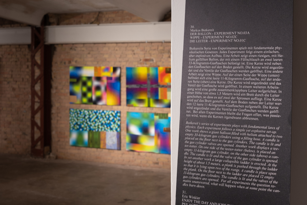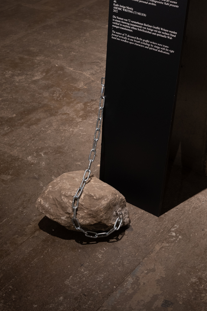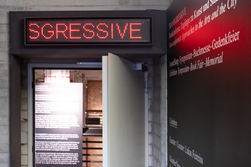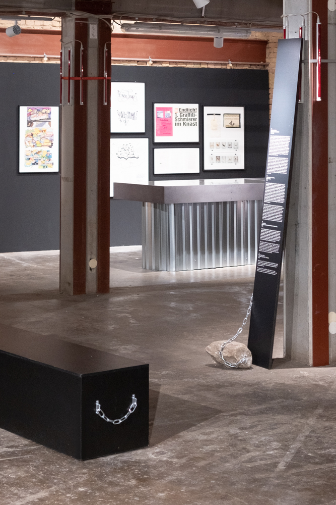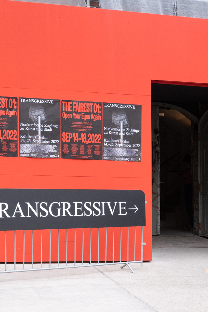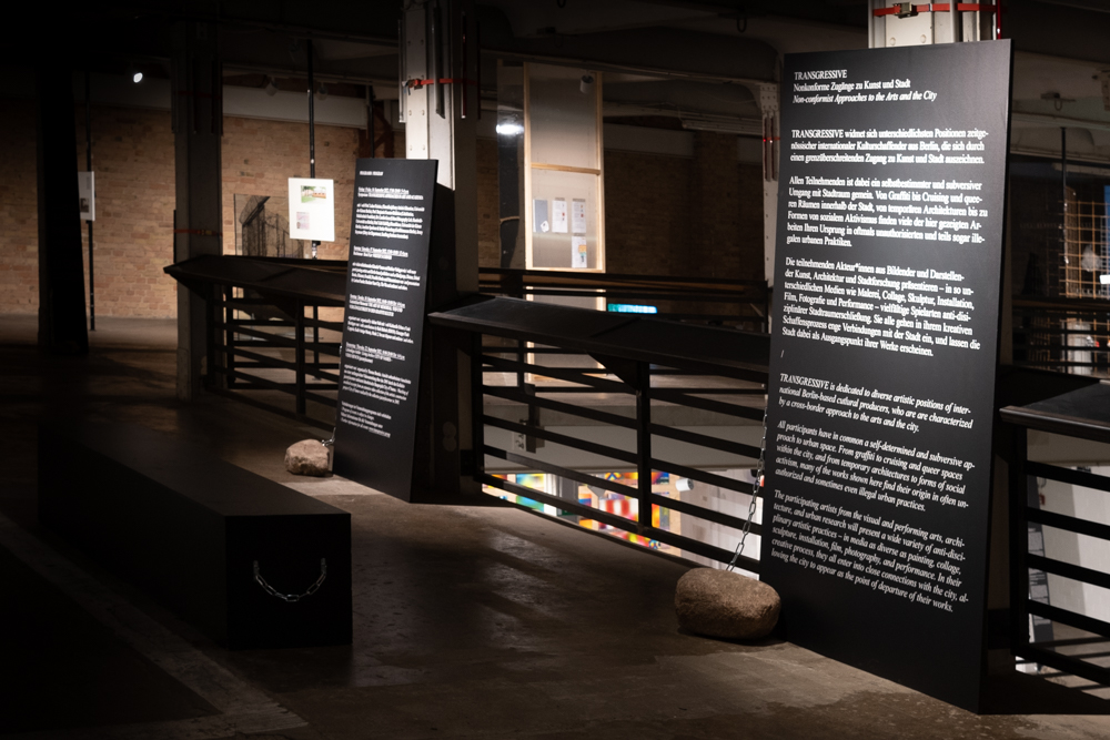 The entire set-up has been reduced to minimum use of resources and outsourcing manufacturing. All the layers of information necessary to navigate the exhibition were concentrated in a minimum series of panels guiding the audience. A series of already existing elements from the storage of the venue have been hacked and transformed avoiding a new production of elements. A set of already existing benches from the venue has been transformed thanks to a plastic film cover and a series of handles using metal chains. This small addition allowed the curatorial team to move them around in order to set up the space for the program of public events. Another example of re-use is a barrier at the entrance partially covered with a welcoming sign. Curated by Lucas Freiress on the occasion of Berlin Art Week, the exhibition collects 48 artists from different backgrounds within a common self-determined and subversive approach to urban space.