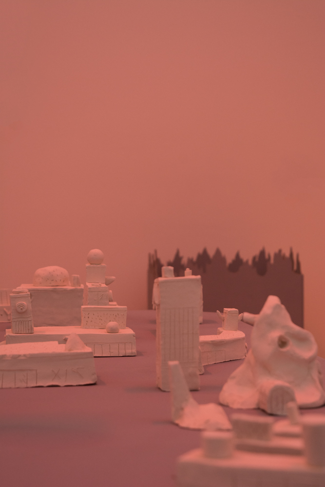 The main reference behind the story is La Città del Sole (The City of the Sun ), written by the Dominican philosopher Tommaso Campanella, and one of the milestones of what has been defined as utopian literature. The book, based on the fictional city of the sun, was written during Campanella’s imprisonment, accused of leading a conspiracy against the Spanish rule and trying to establish a society based on the community of goods. The result is an architectural fabula of sorts. The story serves as a script and backdrop to a city construed as small ceramic maquettes. Together they form a plenary mystic vision combining elements of the primitive-future, new possible tribalisms, modernity’s inheritance of standardization, internet culture’s memetic aesthetic, and non-western symbolism and signs. The project takes shape in three parts: a ceramic maquette of the imagined city where the story takes place, a series of daily objects, and the imperative architecture parlante. The outcome is a sort of theatrical representation, where the actors are a series of artifacts, objects and maquettes, while a narrating voice and a moving spotlight trace a line between them.