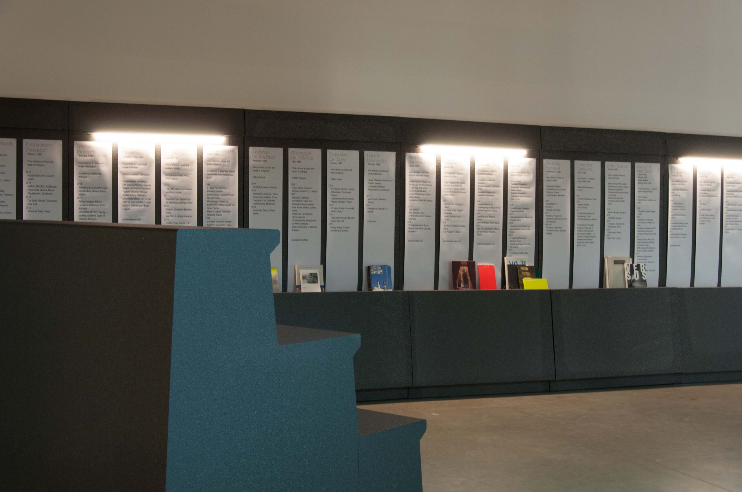 It is an artwork between installation and exhibition design, that aims to reflect on one hand on the modalities through which we receive what is exhibited within the museum, and on the other hand on the different levels of interaction that is possible to build among the contents themselves. The project is composed of two elements: a pair of mobile bleachers and fourteen wall exhibitors – seven for each short wall. Thanks to the mobile elements, it is possible to change continuously the configuration of the space in which the visitors consult the biographies and the bibliographies placed on the wall exhibitors. The dark tones of the material used for bleachers and exhibitors are in contrast with the pale tones of the floor and walls of the space, thus improving their visual impact inside the museum. The lighting system – three neon led integrated into the upper part of the exhibitors on each short wall – is designed in order to define better the area of the biographies and bibliographies. The second source of light comes from Ruth Bera’s artwork placed in the middle of the room. “Audience infrastructure” is a tool of observation, a device to allow the visitor to go deep into the different personalities and references of the artists.