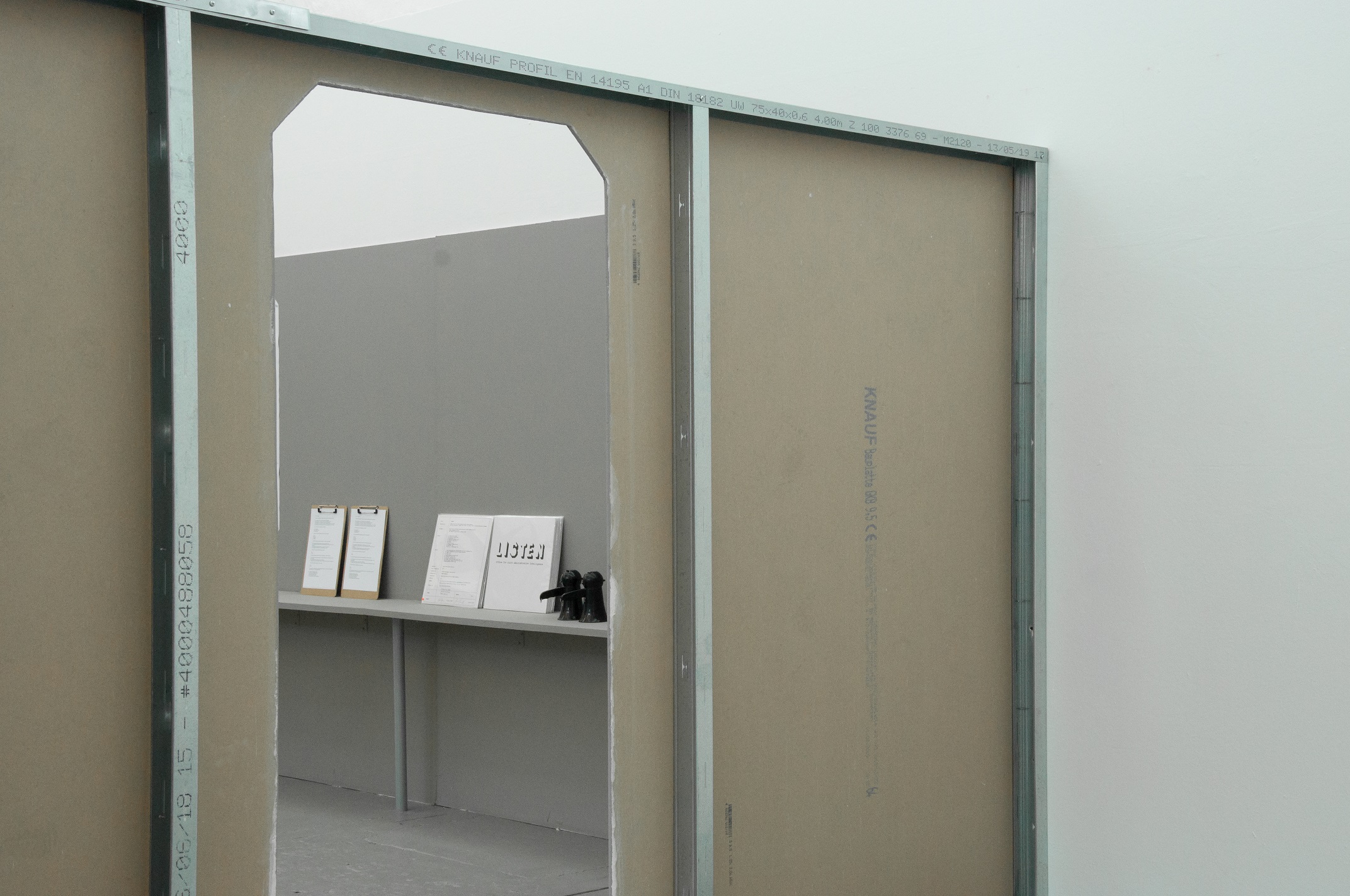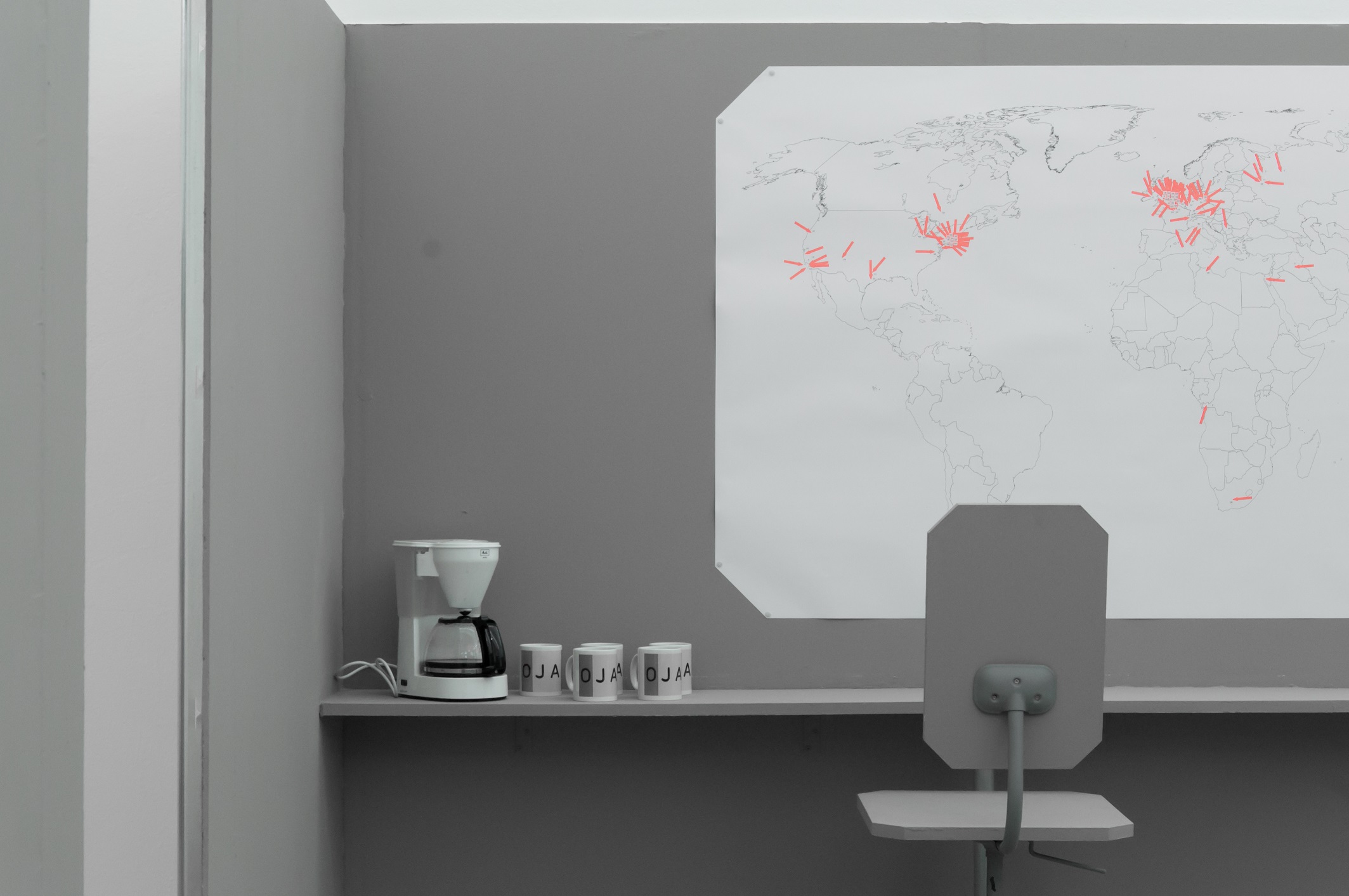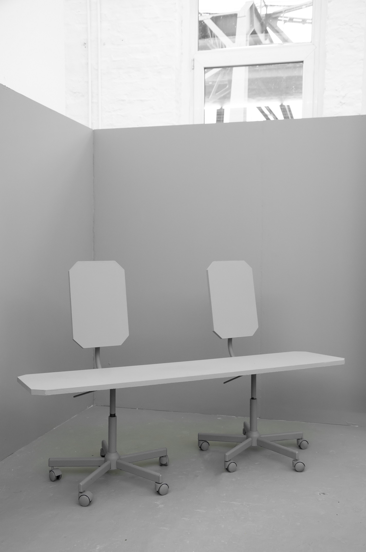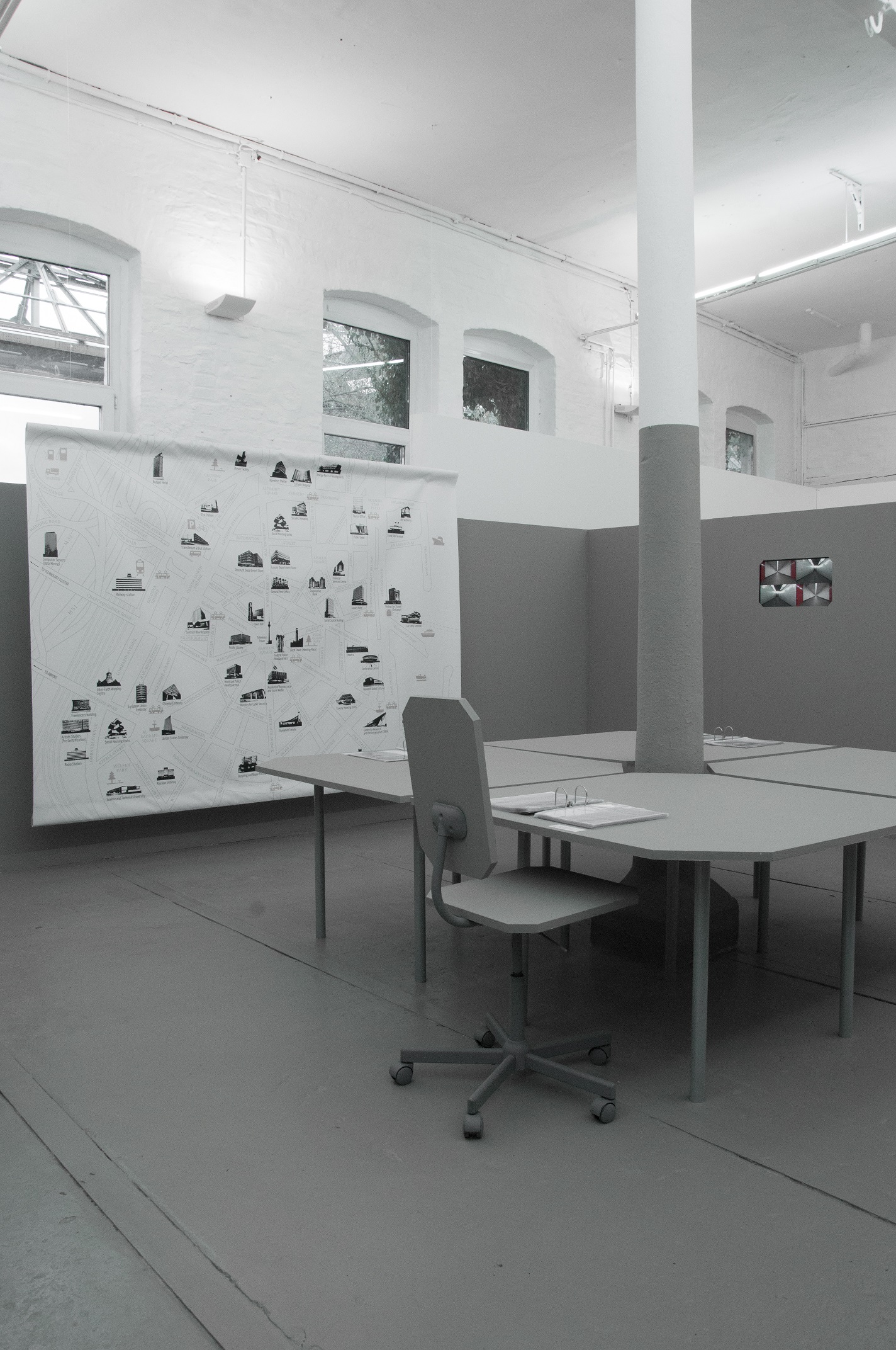 Office for Joint Administrative Intelligence (OJAI) commissioned Parasite 2.0 to design and produce the spatial setting that accompanied the ECII conference and the parallel main exhibition that took place at Grölle pass:projects. “Take them to the waiting room” is a temporary headquarter for a performative practice. The scenography is a flat grey interior inspired by the global standardization of the corporate office environment.
