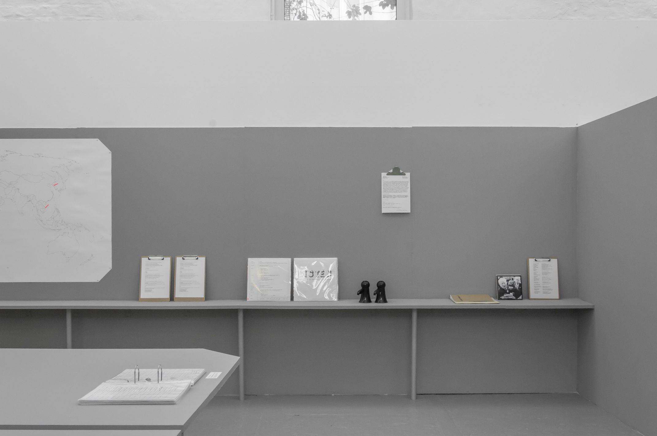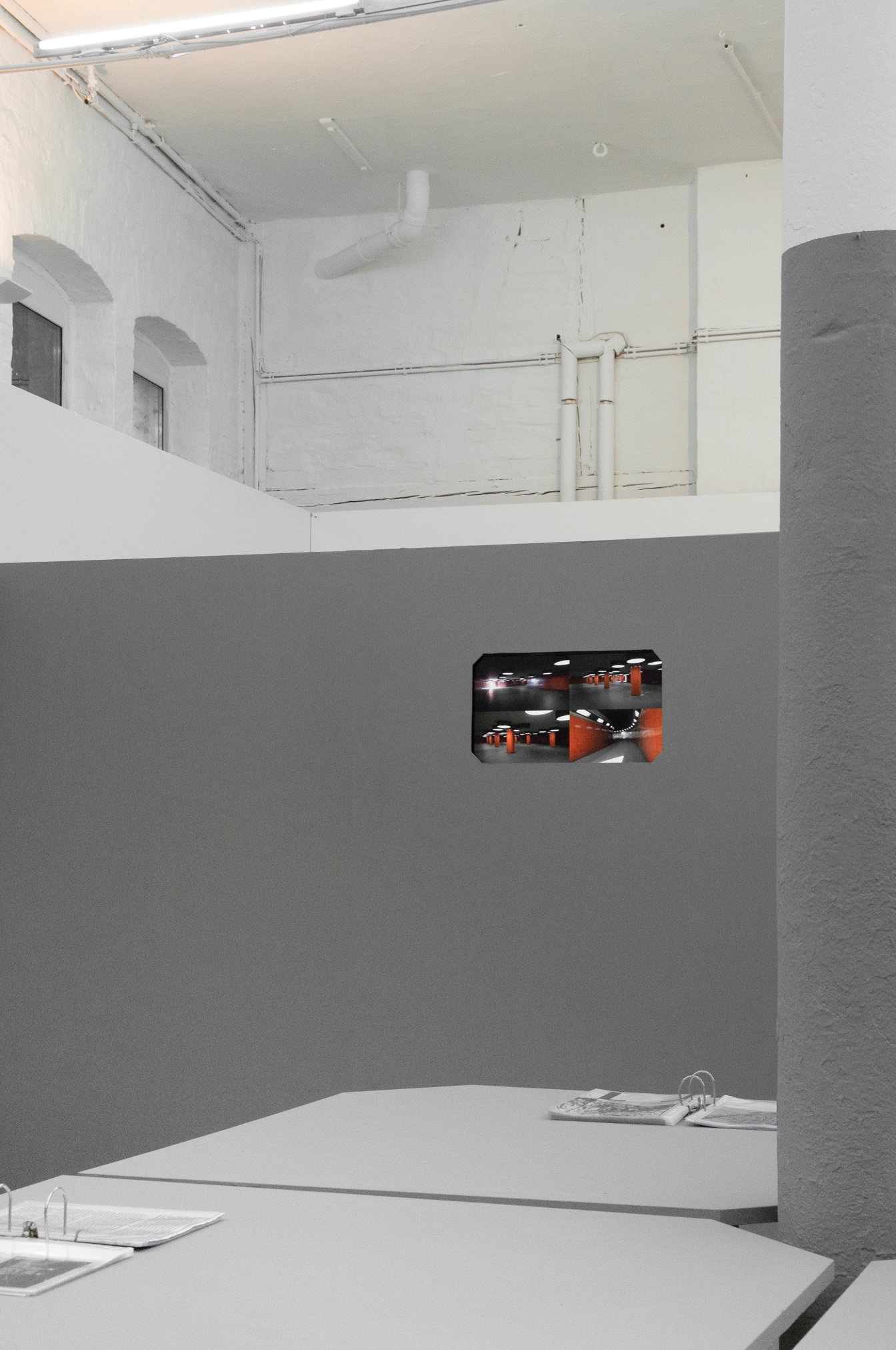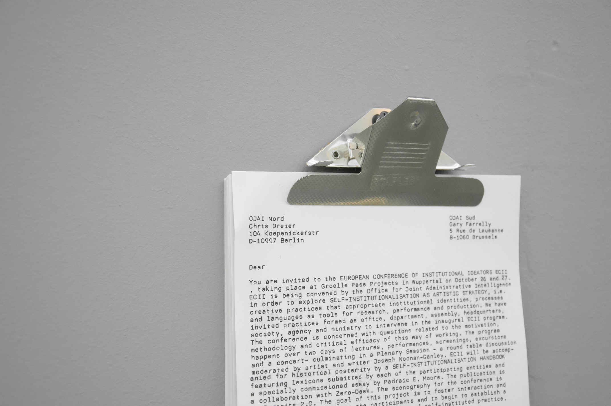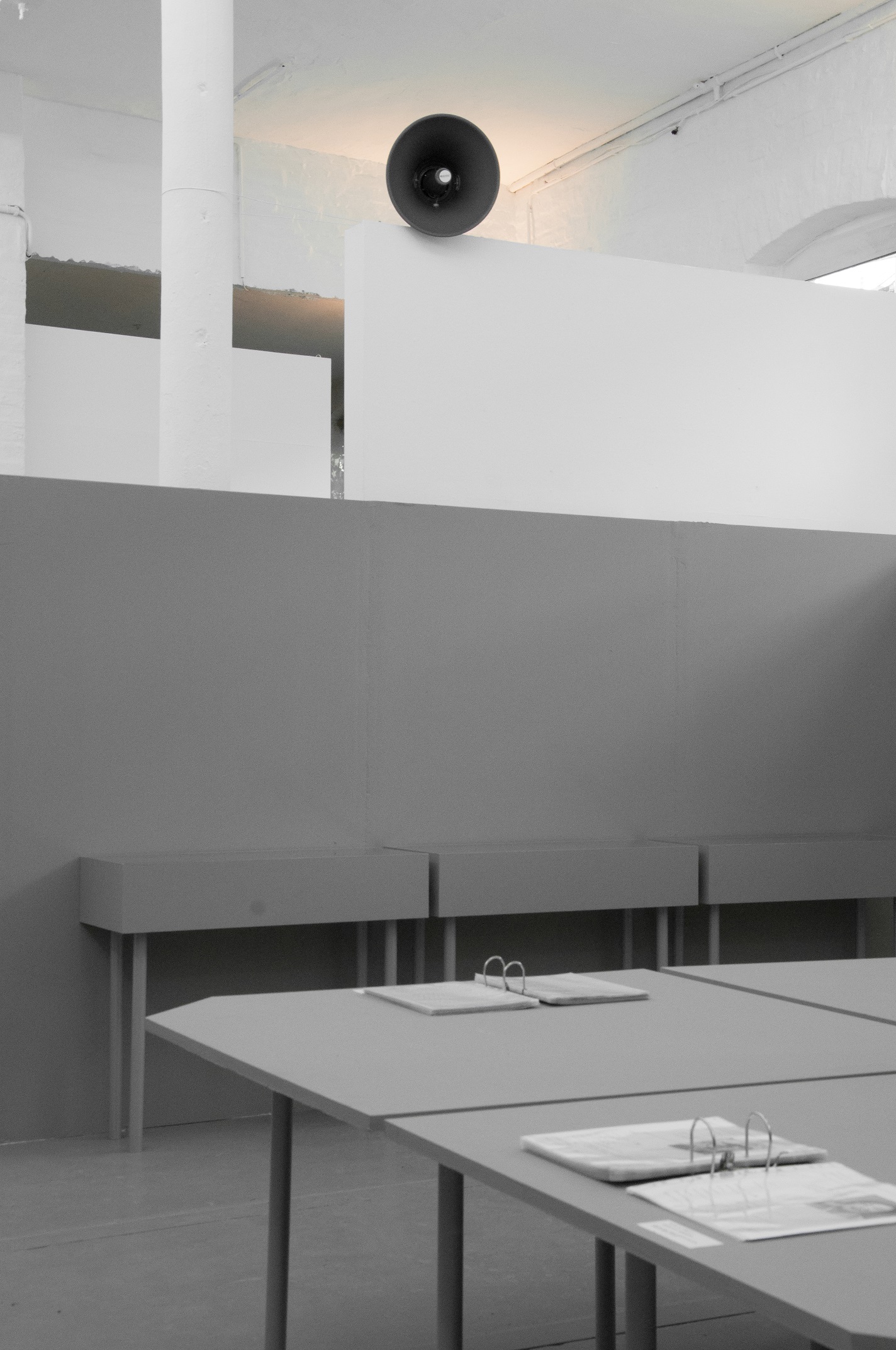 Office for Joint Administrative Intelligence (OJAI) commissioned Parasite 2.0 to design and produce the spatial setting that accompanied the ECII conference and the parallel main exhibition that took place at Grölle pass:projects. “Take them to the waiting room” is a temporary headquarter for a performative practice. The scenography is a flat grey interior inspired by the global standardization of the corporate office environment.
